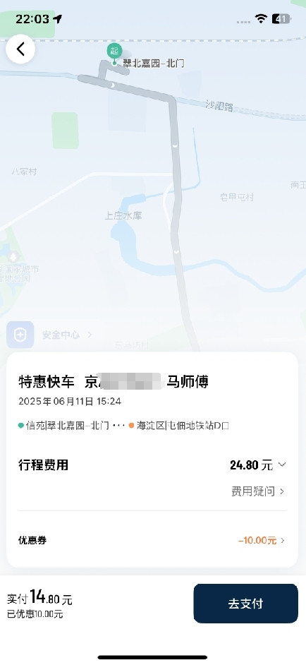 据蔡先生介绍,6月11日下午3时24分,他使用滴滴出行app在北京市海淀区翠北家园北门呼叫网约车。蔡先生称,由于他当天有急事在身,司机抵达上车点的时间本来就比预计等待时间晚了,加之行车过程中,司机行车速度较慢,他便一直在催促司机,原本17分钟的路程走了24分钟。汽车到达目的地后,司机跟在一辆公交车后面开始减速。